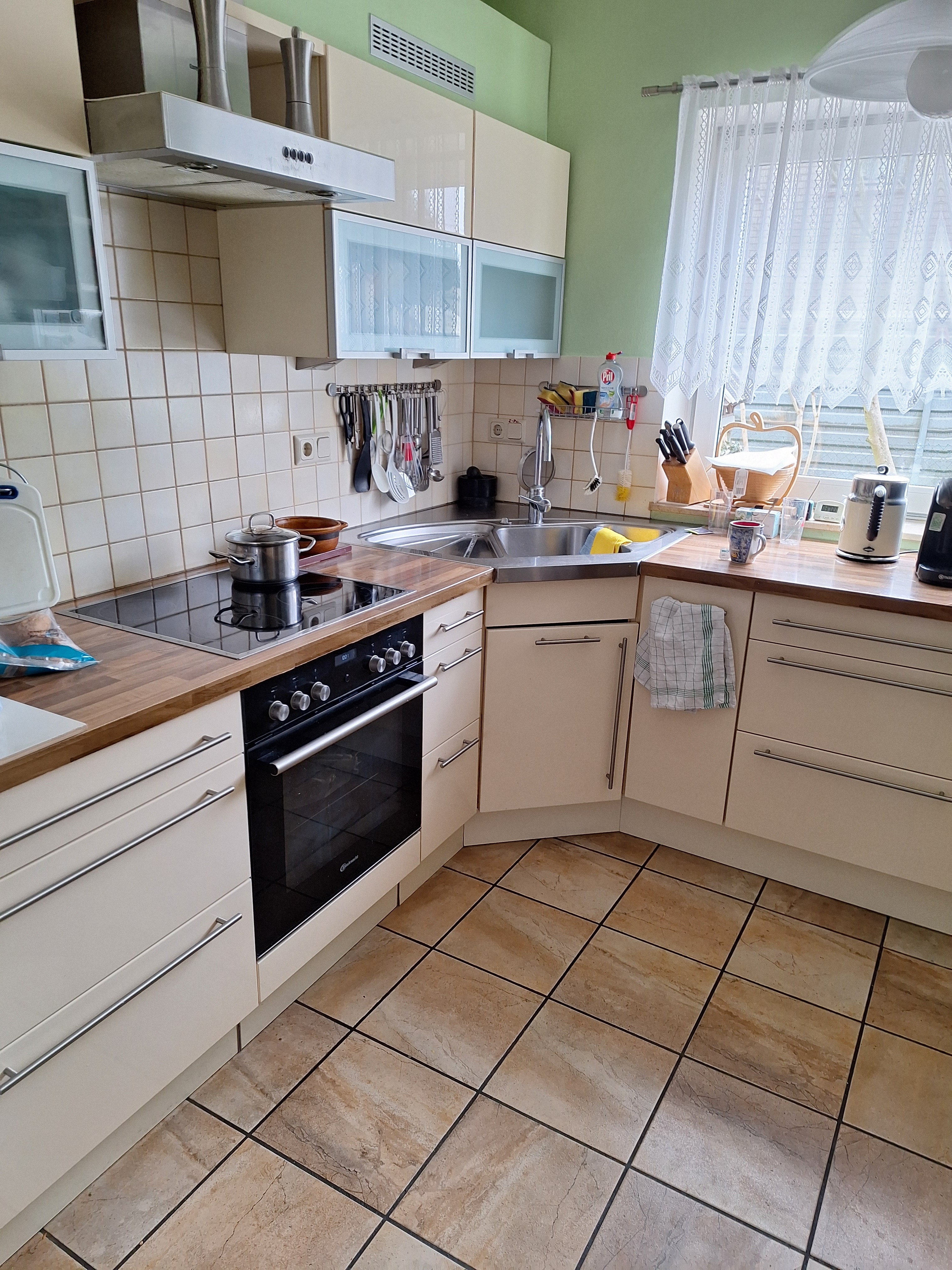Im Erdgeschoss ist der Gäste WC mit einem Duschbad, die Küche mit einem Essbereich, einer Nolte Einbauküche